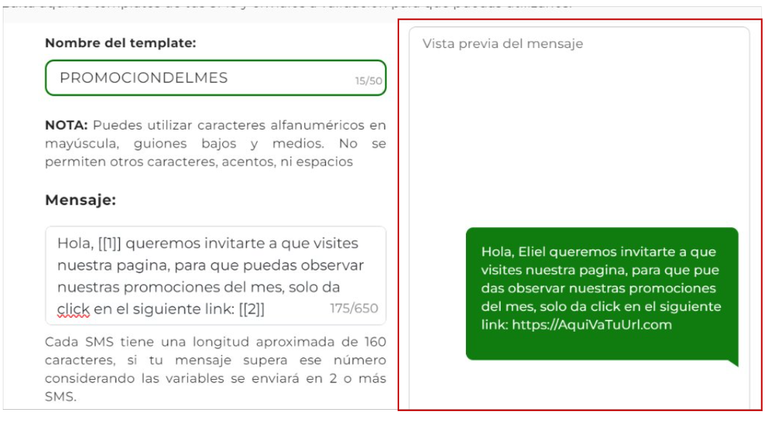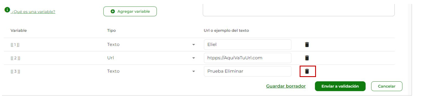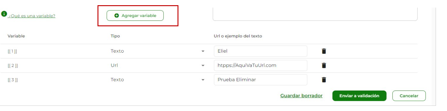 Con ayuda del botón “Agregar variable”, podrás registrar una URL que se enviará en tu mensaje o bien, definir variables de tipo texto que te permiten personalizar tu mensaje como el nombre de tus clientes, por ejemplo.