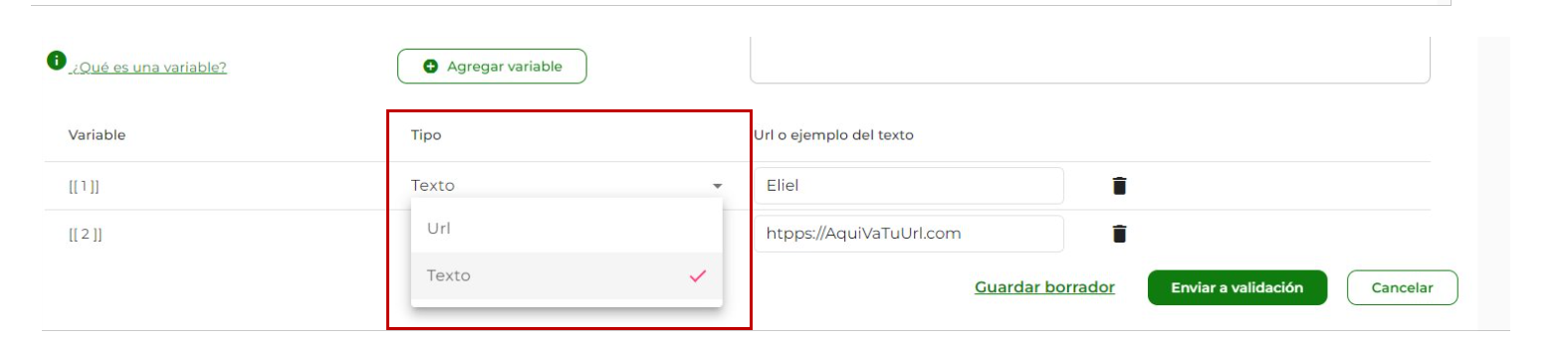 En Tipo selecciona si quieres personalizar tu mensaje con una variable de texto o con una URL.