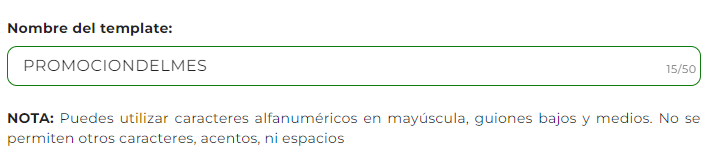 En este campo se debe de colocar el nombre del template con una longitud máxima de 50 caracteres sin espacios. Ten en cuenta que el nombre del template debe ser único, es decir, no podrás tener 2 templates con el mismo nombre.