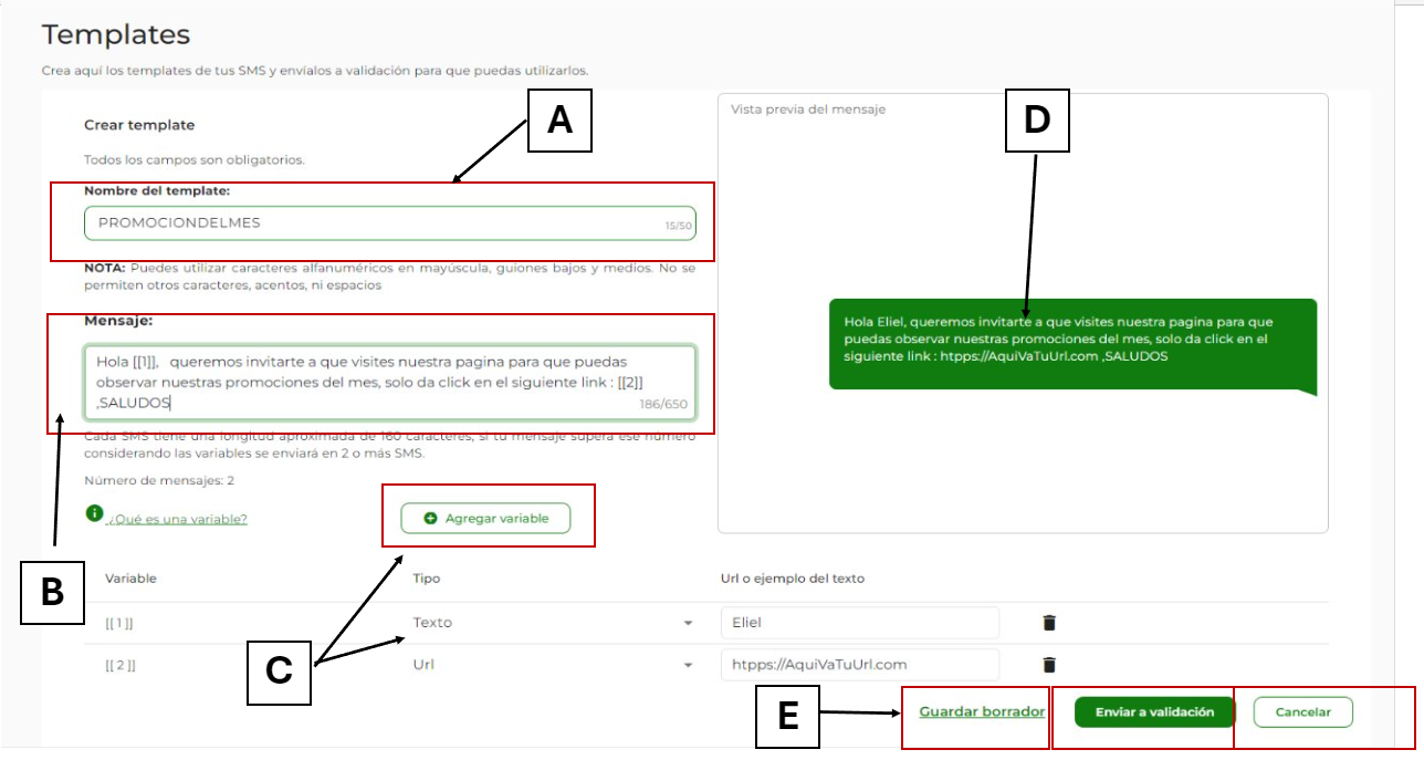 “Guardar borrador”: Guarda el template como borrador para que posteriormente puedas editarlo. Si seleccionas esta opción, el template tendrá estatus Borrador.