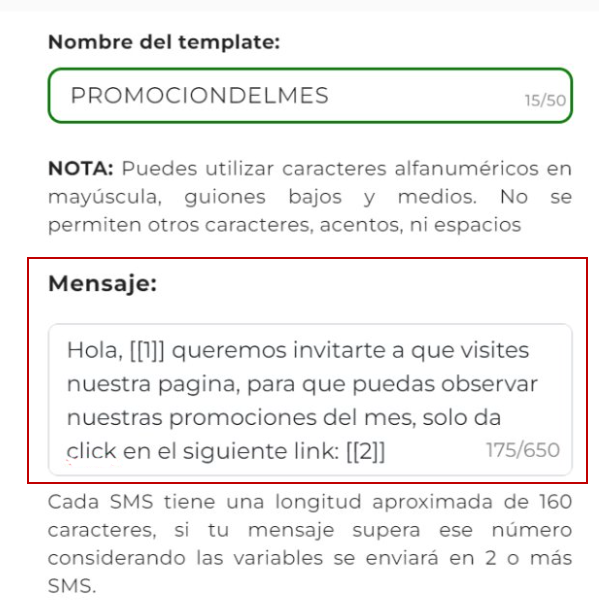 En este espacio podrás escribir el mensaje que se enviará por SMS, si lo deseas podrás enriquecer tu mensaje con URLs o variables de tipo texto. Considera que cada SMS tiene una longitud aproximada de 160 caracteres, si tu mensaje supera ese número (incluyendo las variables) se enviarán 2 o más SMS.