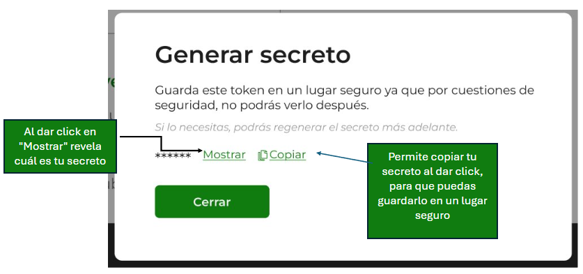 Una vez que se genere el secreto, te sugerimos conservarlo en un lugar seguro ya que por razones de seguridad no será posible que lo vuelvas a visualizar.