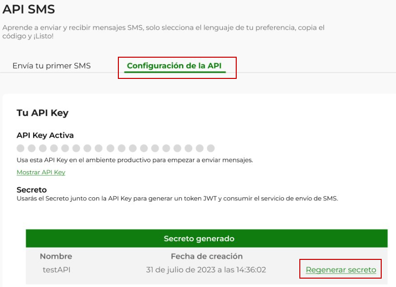SMS → API SMS → Configuración de la API y dar click en “Regenerar secreto”, el procedimiento para regenerarlo es el mismo que llevaste a cabo para crearlo.