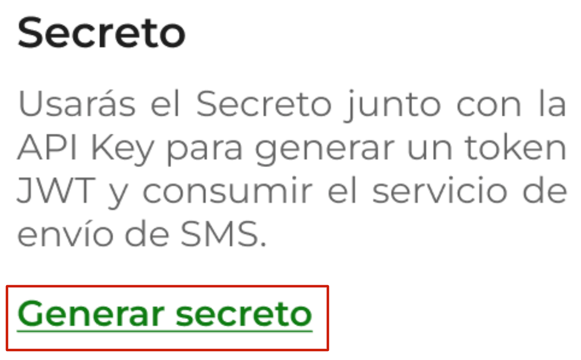 Para generar el secreto debes de ir a la sección SMS → API SMS → Envía tu primer SMS