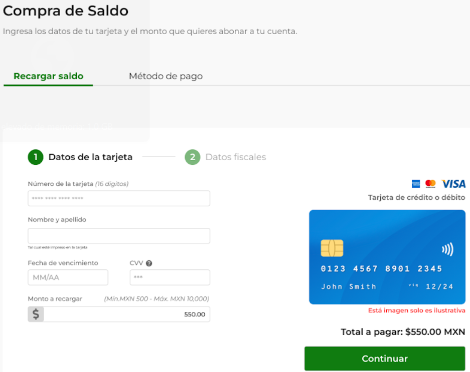 Ingresa los datos de tu tarjeta así como el monto de saldo a recargar a tu cuenta y da click en “Continuar”.