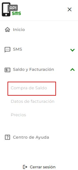 Para realizar la compra de saldo, dirígete al menú lateral izquierdo y selecciona Saldo y Facturación → Compra de saldo.