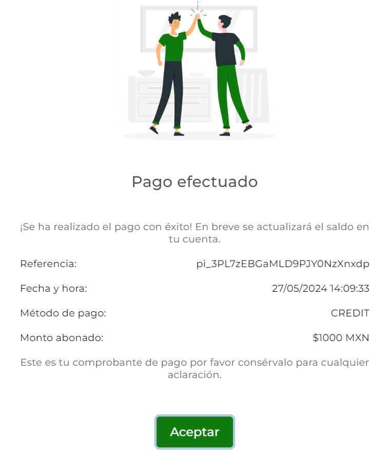 Una vez que el cargo a la tarjeta sea confirmado por el banco, se mostrará el comprobante de pago, te sugerimos conservarlo para cualquier aclaración.