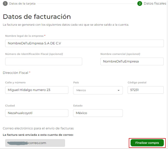 Posteriormente, captura los datos solicitados en Datos de facturación para realizar la factura correspondiente, una vez ingresados los datos marcados con asterisco, da click en “Finalizar compra”.